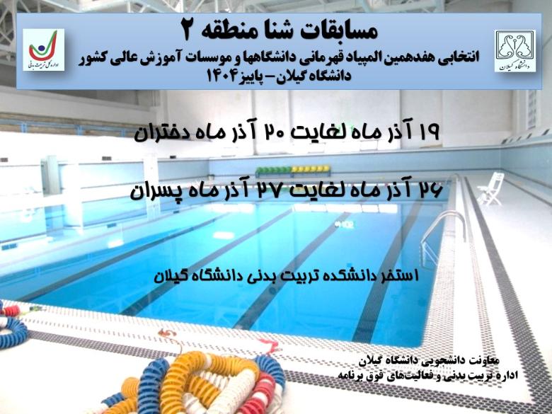 مسابقات شنا دانشجویان پسر دانشگاهها و موسسات آموزش عالی منطقه ۲ کشور به میزبانی گیلان 27 آذرماه ۱۴۰۴ بازیکنان تیم دانشگاه گیلان آقایان : پارسا حلاجی - علی متین نژاد- پارسا باقر پور- سپهر اصلانی فر-نیما غلامی - دانیال کمیلی کسب مقام دوم در 100 متر پروانه و مقام سوم در 50 متر پروانه : پارسا باقرپور کسب مقام اول در 100 متر کرال پشت و مقام دوم در 50 متر کرال پشت : پارسا حلاجی ثانی کسب مقام اول در 400 متر و 200 متر آزاد : علی متین نژاد کسب مقام اول مختلط تیمی 50*4 : حلاجی، غلامی، باقرپور ، کمیلی تیم دانشگاه گیلان با مجموع 203 امتیاز مقام دوم مسابقات را کسب و به مسابقات المپیاد همگانی 1405 راه یافت. مربی تیم : عماد پور صفر مربی بدنسازی و سر پرست : مجتبی محمدی