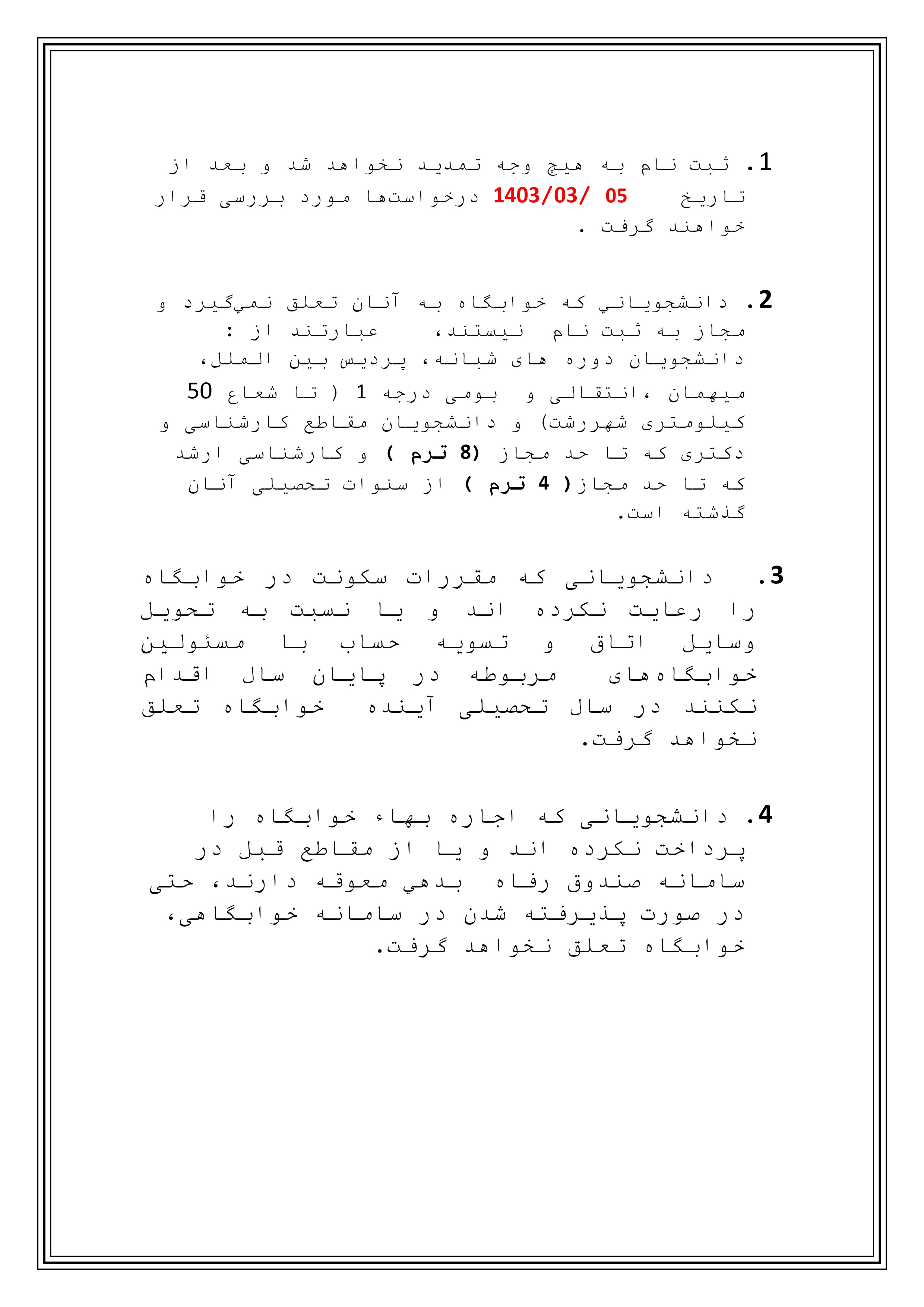 شرایط و مهلت درخواست خوابگاه برای سال تحصیلی1404-1403