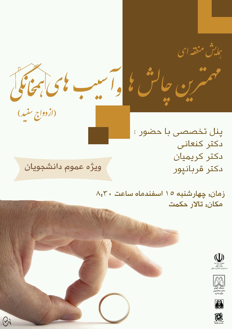 مرکز مشاوره و کانون همیاران سلامت روان دانشگاه برای کنترل و کاهش آسیب های اجتماعی در دانشگاه، همایش منطقه ای مهمترین چالش ها و آسیب های همخانگی (ازدواج سفید) در دانشجویان را در روز 97/12/15 ساعت 8.30 الی 12.30 در تالار حکت برگزار می نماید. این همایش بصورت پنل تخصصی با حضور کارشناسان حوزه های روانشناسی، جامعه شناسی و دینی برگزار می شود. مخاطبین این همایش کارشناسان و دانشجویان همیار سلامت روان دانشگاههای منطقه 2 (دانشگاههای استان گیلان، مازندران و گلستان) می باشند .همچنین مراسم اختتامیه مسابقه دانشجویی منطقه ای دانشگاه: شادی، نشاط و سلامتی با برنامه های شاد و متنوع از ساعت 13.30 الی 16.30 همانروز در تالار حکمت برگزار می شود.
